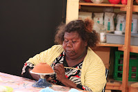 So come Monday we mixed up some slip from the natural clay pan in Titjikala and painted the deep red, brown clay onto the bowls. Then it was time for the artists to make their mark. |